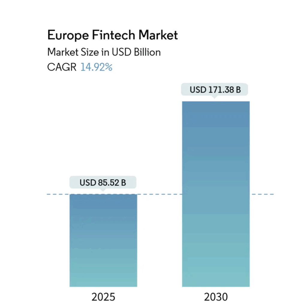 According to Mordor Intelligence, the European fintech market is expected to grow from $85.52 billion in 2025 to $171.38 billion by 2030, starting in 2024. This means that the market will grow at a compound annual growth rate (CAGR) of 14.92%, and there will be a medium level of market concentration during the forecast period.
